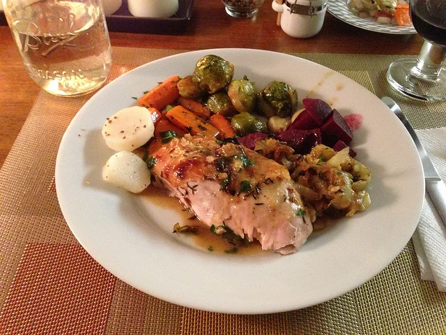Being a houseguest usually leaves me at the mercy of other peoples refrigerators. Thankfully I spent a few nights in Williamsburg with two people who love to cook. On Wednesday night we pit two ways of cooking against each other: regular conventional stove and fancy sous vide machine. The chicken, brussel sprouts and fennel went in the oven and the daikon, beets and carrots went into the hot water.